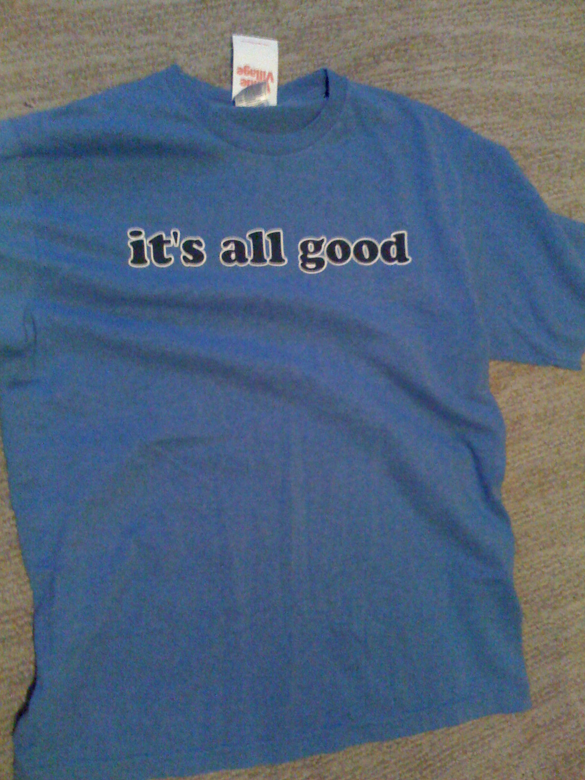 I don’t think you can find a shirt like this on purpose. You would probably have to go to a print shop and face the embarrassment of saying you want a shirt reading “it’s all good”. Luckily for me, there is Value Village.