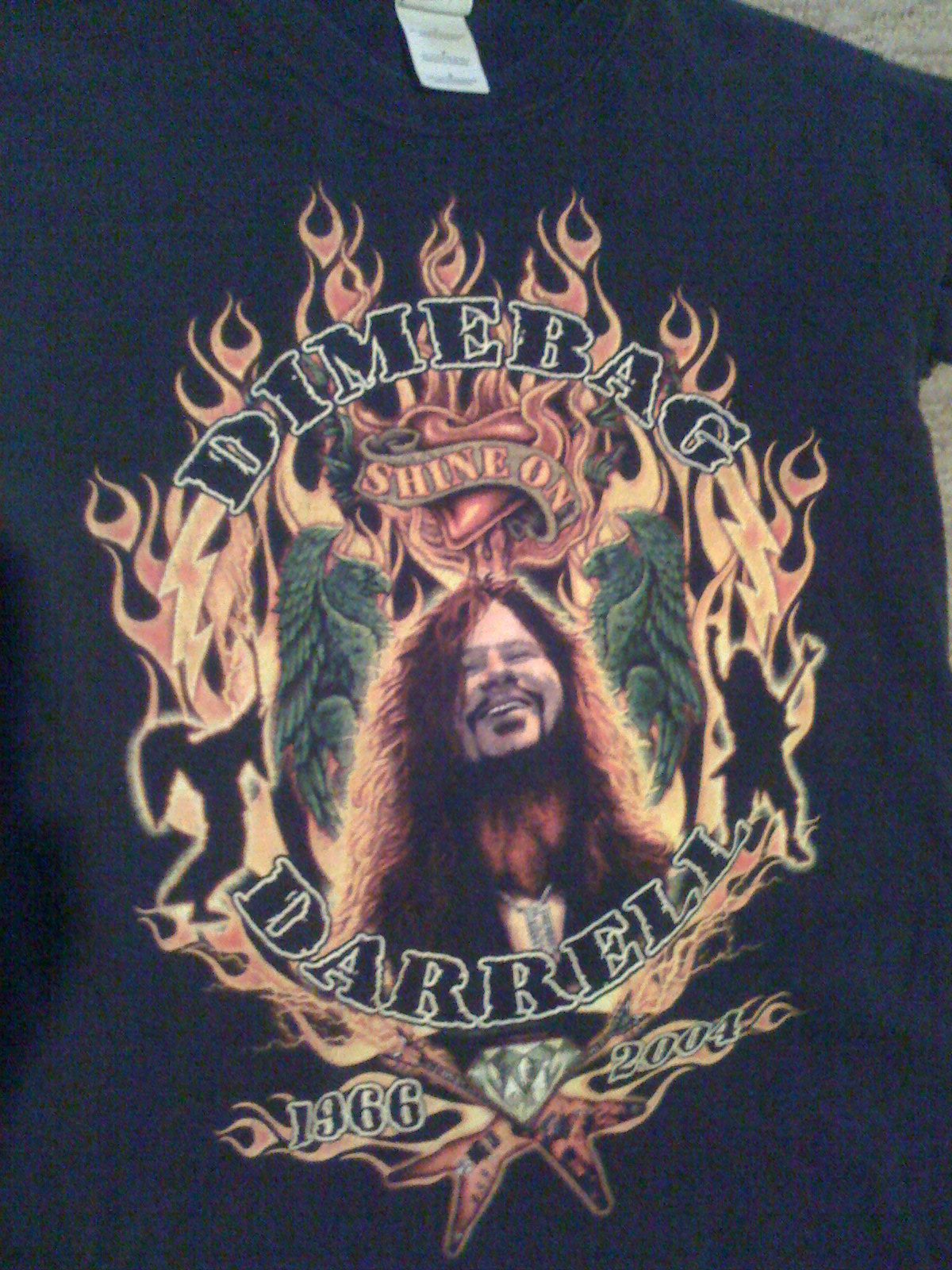 Holy Hell! A tribute to Dimebag Darrell, the late guitarist from Pantera! Who would ever part ways with such a shirt? Who ever they are, may they get a rash every time “Cowboys From Hell” is on the radio. Regardless, I own it and I am a little saddened that I already met Phil and Rex a few weeks ago and missed the opportunity to rub Darrell in their face. Kittymao knows what I am talking about.