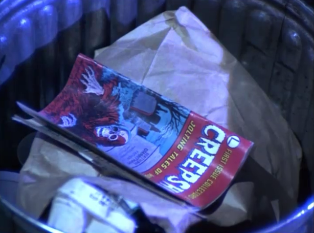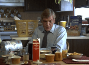 We can hear from the outside of the house that someone is in deep shit for having taboo literature and buddy, he is getting a lashing from the legend himself, Tom Atkins. Tom is giving the ol’ what-for over finding a copy of the comic, Creepshow, in his kid’s room and to defend himself, the kid points out it’s not as bad as some of the magazines Tom has in his sock drawer.