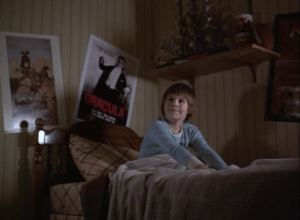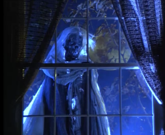 Let me first say that this kid is pretty cool. Noted he came from a Tom Atkins’ character’s loins but still, his room decor and choice of comics makes him a friend of Veggiemacabre. Anyway, he is also awesome because he is not scared at all of this thing looking in his window…