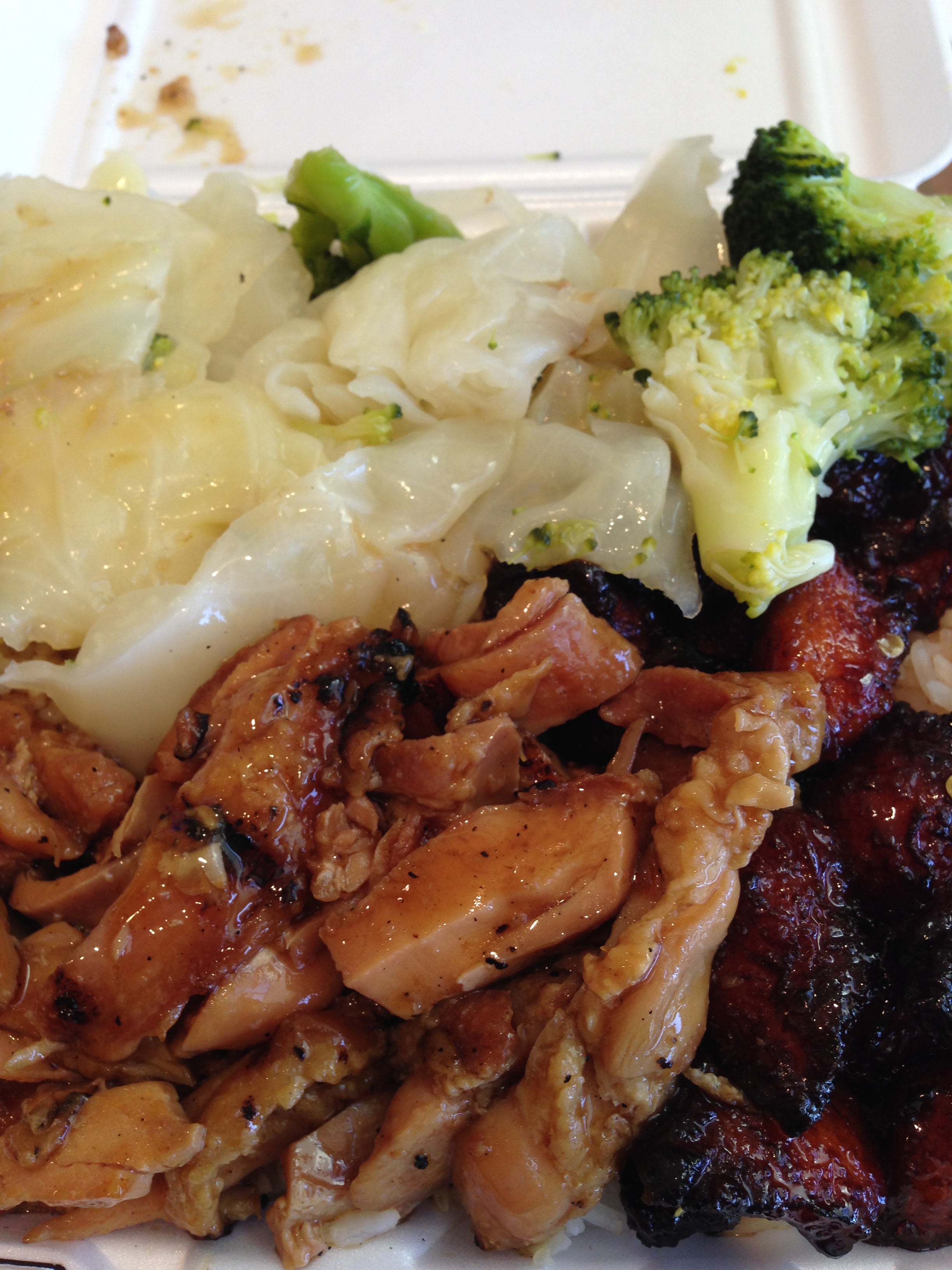 I chose the spice chicken/Teriyaki Thai chicken with steamed vegetables and basil rice all for $8.00. And it was pretty damn awesome. In fact, I was so impressed with this mall food court dish I think I told my coworker if I wasn’t in a mall and she wasn’t present I would take off my shirt and paint murals of horses to the music Schubert out of pure food inspiration. She said nothing. In fact, her face was a bit contorted and rightly so. I saw what she got from…