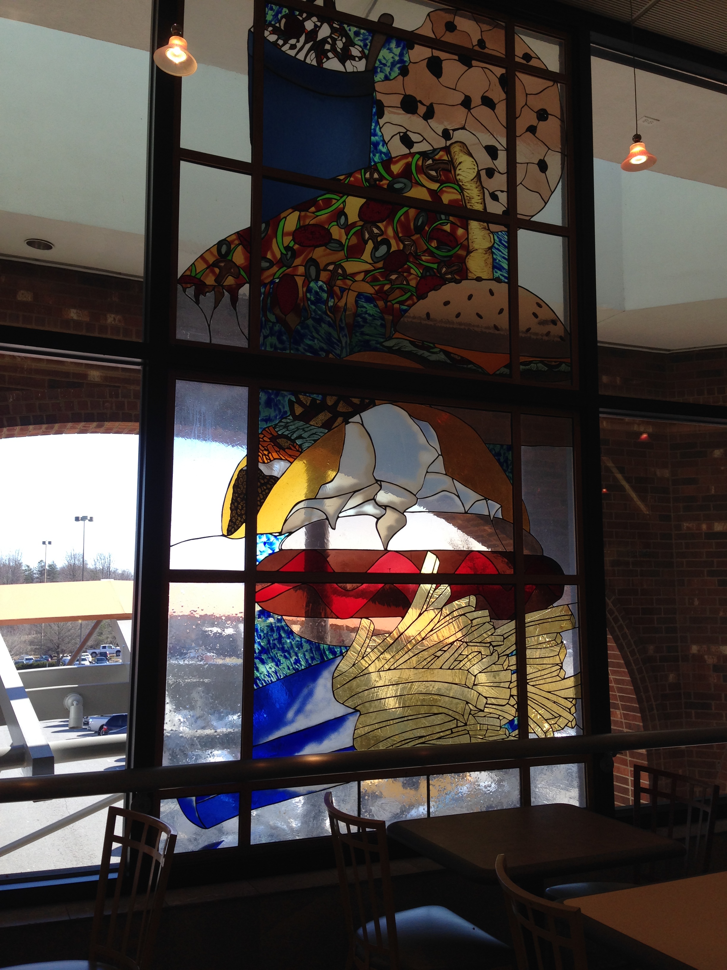 So, in conclusion, it was a nice break from the office with tons of people watching and I was able to return some pants to Banana Republic. Since Banana Republics live in malls, I guess I am forced to venture in once in a while. This was a great excuse. And at leaset I was able to eat in the basking glow of this amazing stained glass art.
