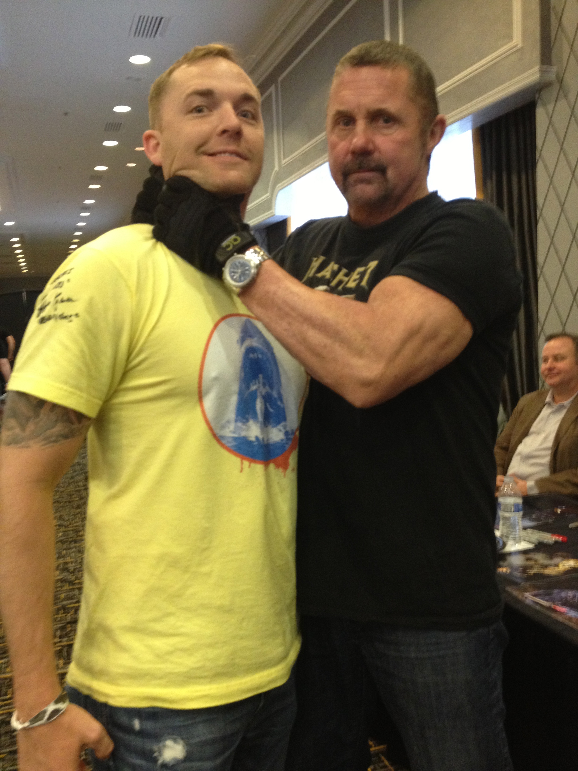 Kane Hodder, ladies and gentlemen, the legend who played Jason in the Friday the 13th and Hatchet I and II. And that’s a real chokehold! Keep in mind, he plays Jason and is about three inches taller than me. Here it looks like we are the same height. I will admit, I was a bit surprised by that grip.