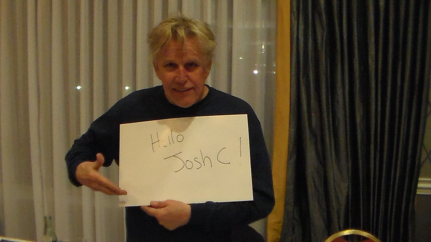 Me: Hello Mr. Busey, I’m a big fan but my buddy Josh can’t be here. Could I get a picture of you holding this saying hello to him?