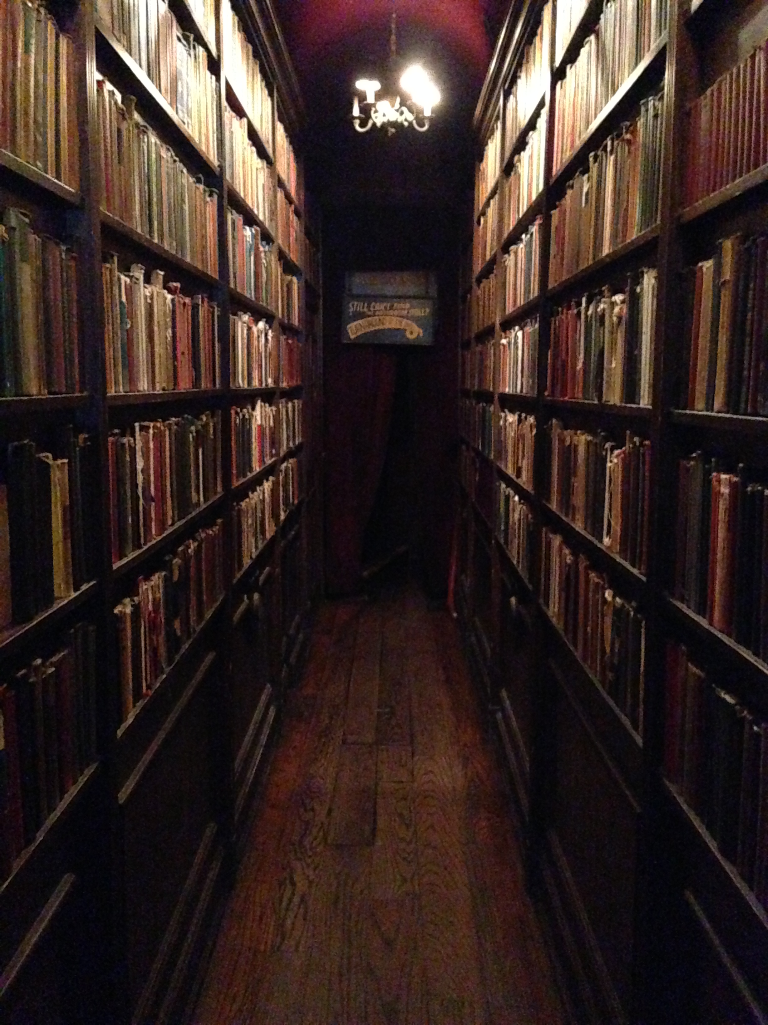 Like they say, you only rent the beers you drink and soon I was in search for a men’s room but that too was an adventure. At the far end of the dining room there is a long hallway lined with bookcases. I walked down to the end and back again, met with the staff who giggled at my obvious discomfort and total confusion. Anna said to try harder and read the clues like the sign at the end of the hall. Makes one wonder how much puke they clean up on a busy Saturday night from a drunk patron who had no time for clues or hidden doors.