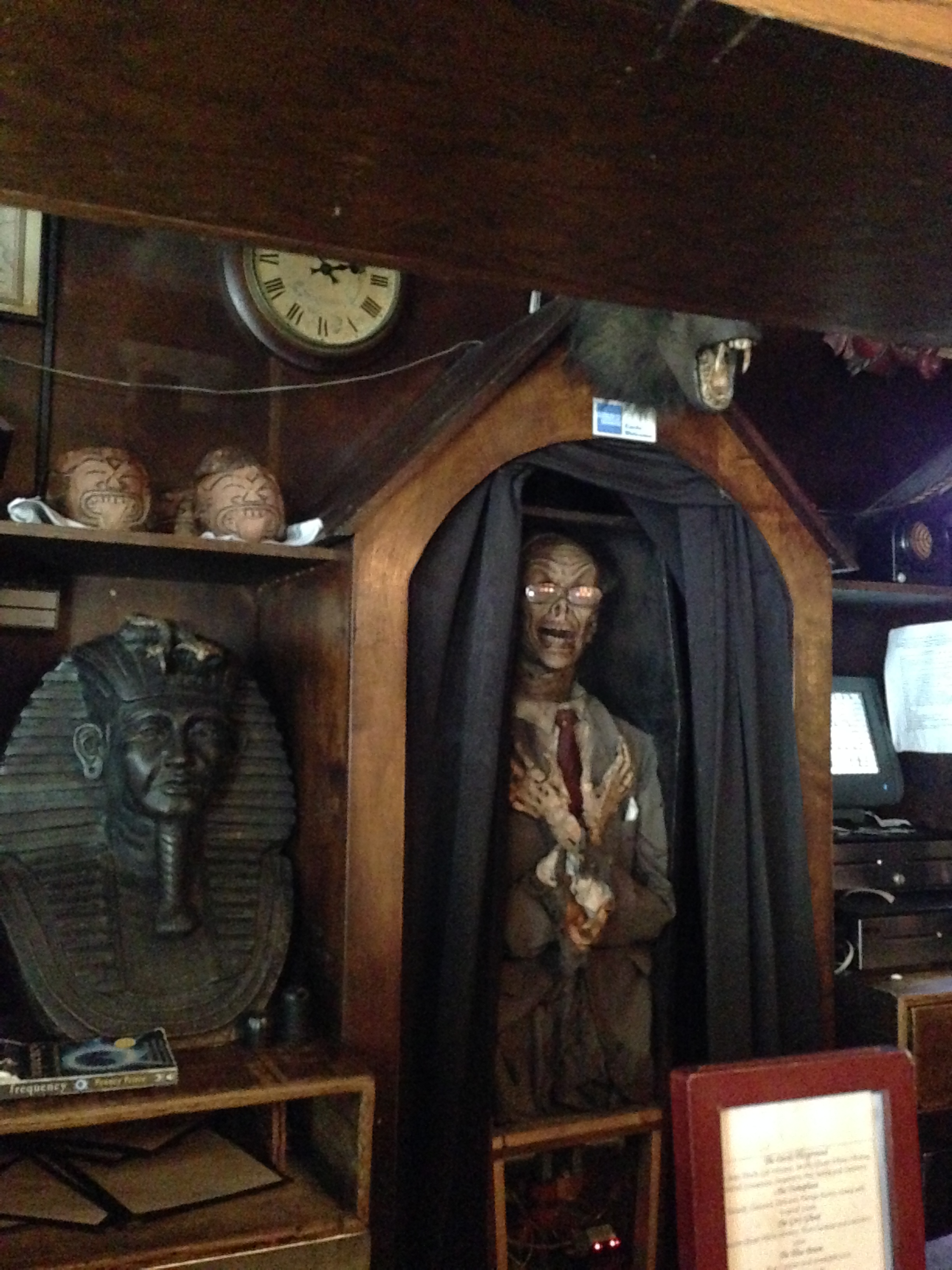 See? This is a place that has surprises around every corner and in this case, a coffin door behind a curtain with a sophisticated corpse. I love it.
