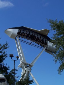 I suppose I should explain the mechanics of this coaster. There are about eight rubber tired wheels on the base underneath the flat belly of the shuttle which keeps the momentum and also slows it down. The shuttle itself rocks back and forth, like a pendulum, until it become totally inverted and completes a series of loops. Here’s a video of the exact ride.